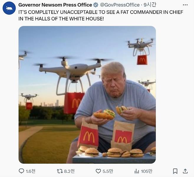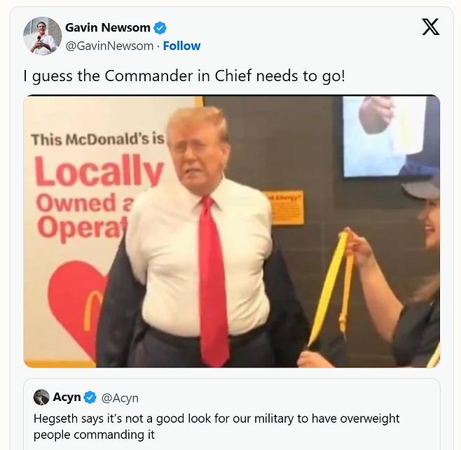 이에 민주당 유력 잠룡의 한 명인 개빈 뉴섬 캘리포니아 주지사는 X에 "그렇다면 총사령관(대통령 의미)부터 나가야겠군!"이라는 글을 올리며 트럼프 대통령을 겨냥했습니다. 해당 게시물에는 지난해 10월 맥도날드 유세 현장에서 찍힌 뚱뚱한 트럼프 사진이 함께 게재됐죠. 당시 트럼프는 일종의 '서민 행보'로 맥도날드 드라이브스루 창구에서 직원 복장을 하고 직접 햄버거와 감자튀김을 나눠주었는데, 이는 국방부 장관은 과체중을 비난하는데 트럼프도 과체중이고, 비만의 주범인 패스트푸드를 트럼프가 직접 나눠주거나 본인도 좋아하는 것을 비꼰 것입니다.
