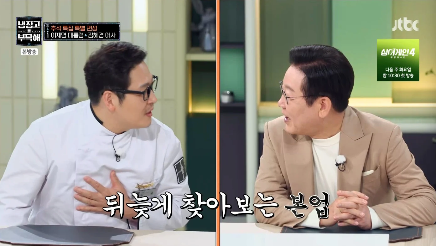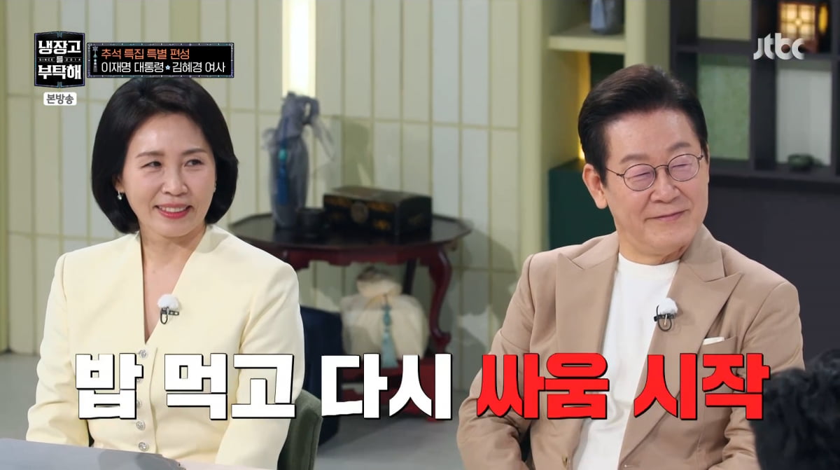 정치권에서 고소고발전이 벌어지고 있는 가운데 이재명 대통령과 영부인 김혜경 여사 내외가 출연한 JTBC 예능 프로그램 '냉장고를 부탁해 since 2014'가 추석 당일(6일) 저녁 전파를 탔습니다. 애초 이 방송은 5일 저녁 저녁 특집편을 방송될 예정이었으나 국가정보자원관리원 화재 이후 관련 업무를 맡고 있던 공무원이 스스로 목숨을 끊으며 정치권에서 이재명 대통령의 행적에 대한 논란이 일었고, 5일 대통령실은 "국가공무원의 사망으로 전 부처가 추모의 시간을 가지고 있는 점을 감안해 JTBC 측에 방영 연기를 요청하게 됐다"고 안내한 바 있습니다.