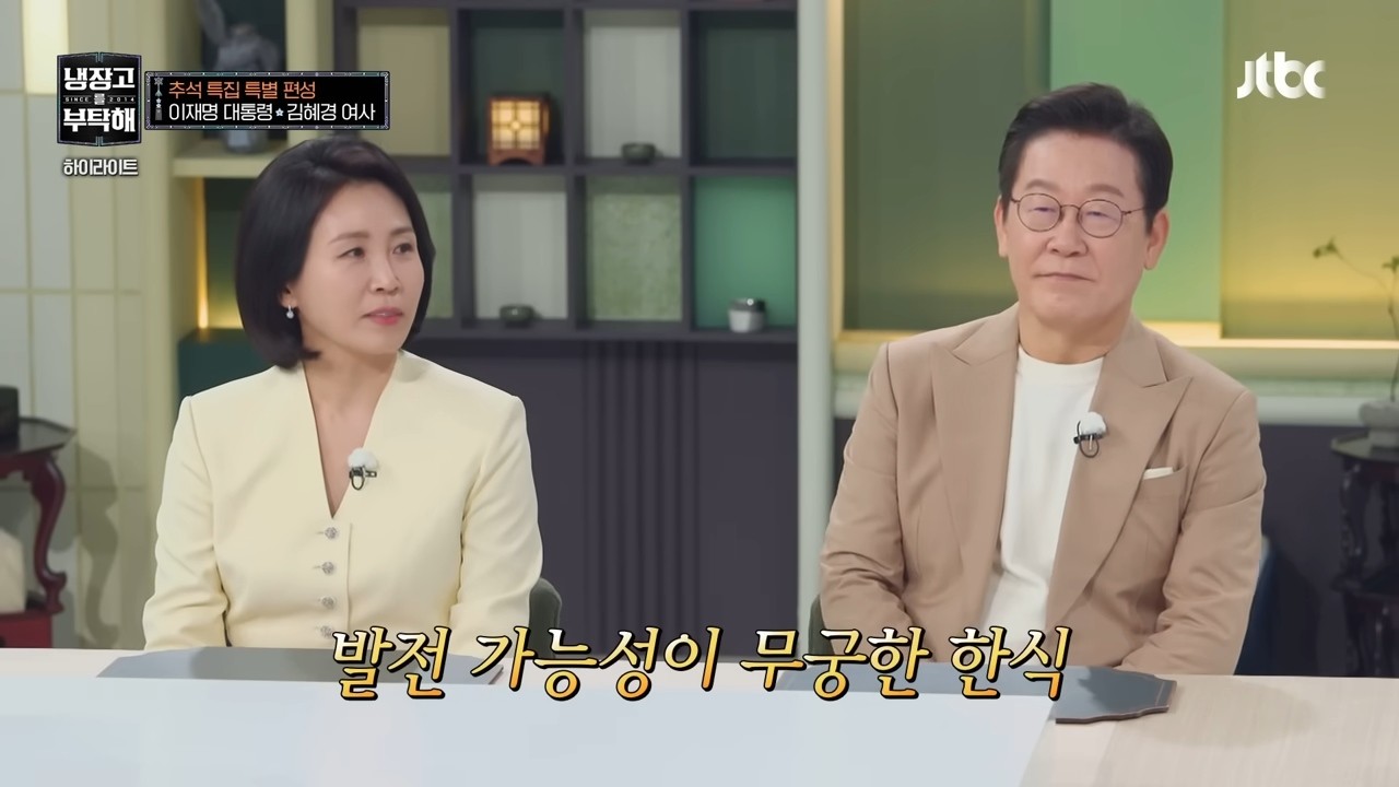 이재명 대통령 부부가 등장하자 출연진들은 일제히 기립하며 놀라움을 감추지 못했습니다. 이 자리에서 이재명 대통령은 '전 세계에 알리고 싶은 K-푸드, 자연스럽게 한국의 식탁으로 초대할 수 있는 음식'과 '전 세계에 알리고 싶은 K-식재료 시래기 요리'를 주문했죠. 이 대통령은 "음식은 한번 입에 고정이 되면 쉽게 안 바뀐다. 지속성이 있다. 한국 문화를 수출하는 데, 산업으로 대한민국을 키우는 데 큰 도움이 된다"면서 "우리나라가 자원이 별로 많지 않다. 문화가 자산이고 K-팝, 드라마도 중요하지만 진짜 문화의 핵심은 음식이다. 이 프로그램이 인기가 많다보니 K-푸드 홍보에 도움이 될 것이라고 생각했다"며 출연 계기를 밝혔습니다.