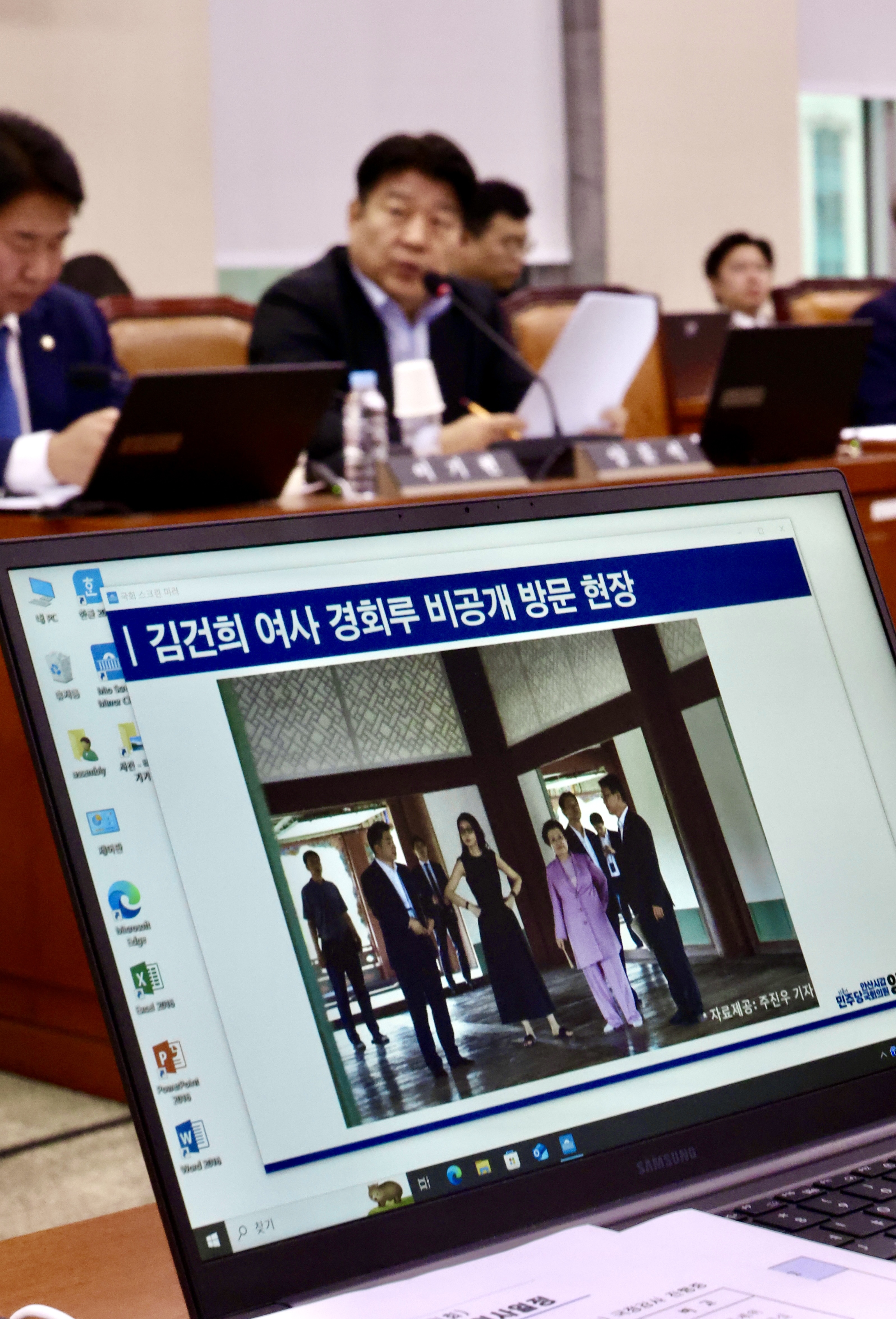 사진 속에는 이날 두 사람을 수행했던 정용석 국립박물관문화재단 사장(당시 대통령실 문화체육비서관실 선임행정관), 황성운 전 대통령실 문화체육비서관, 최응천 전 문화재청장의 모습도 확인됐습니다. 정 사장은 22일 국회 문화체육관광위원회 국감에 출석해 이날 상황에 대해 추궁을 받았고 '이 전 위원장의 권유로 김 여사가 근정전 어좌에 앉은 것으로 기억된다'고 인정한 바 있습니다. 또한 이기헌 더불어민주당 의원이 확보한 이날의 경복궁 상황실 관리 일지를 보면, 김건희 여사는 일지에 'VIP(통상적으로 대통령을 지칭)'로 표기돼 있었다고 하죠.