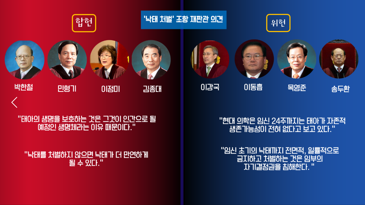 2012년 헌법재판소에서는 합헌과 위헌 의견이 4대 4로 동률을 이뤄 6명에 미치지 못했기 때문에 현행 처벌 규정이 유지됐었죠. 당시 헌재는 "낙태죄 조항으로 제한되는 사익인 임부의 자기결정권이 위 조항을 통해 달성하려는 태아의 생명권 보호라는 공익보다 결코 중하다고 볼 수 없다"고 합헌 결정 이유를 설명한 바 있습니다.
